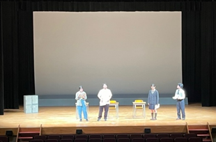 令和7年6月7日(土)に大津市北部地域文化センターにおいて第39回滋賀県高等学校演劇大津地区研修合同発表会が開催され、比叡山高校、幸福の科学高校、石山高校とともに高島高校演劇部も参加し、「拝啓、愛する人様へ!」を発表してきました。この作品は三年生の松川さくらさんが書いたオリジナル脚本で、卒業式をクライマックスにした高校生「松浦瑚華」の成長物語です。ケンカの場面はアクションが大きく、卒業式の場面は厳粛な挙止動作をするなど、場面の違いを意識して作り込むのが難しかったのですが、無事に上演することができました。